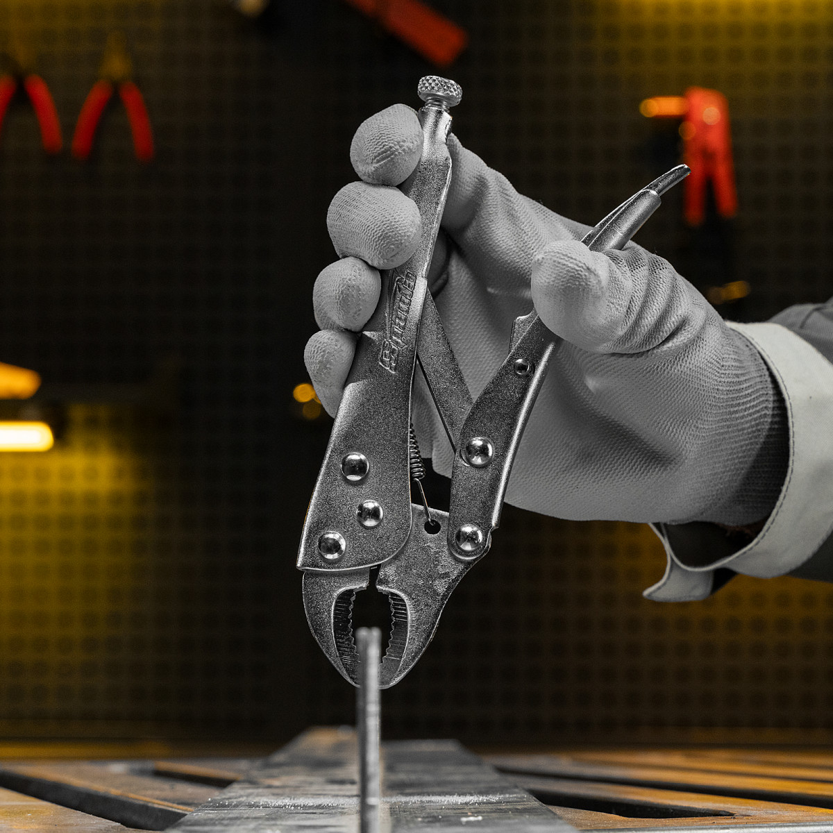 Ручной зажим Sparta 184205 длиной 180 мм, с полукруглым захватом, позволяет фиксировать детали разной формы для последующей сварки, резки, шлифовки и других работ. Используется в слесарном деле, во время строительства и ремонта, для проведения кузовных работ, а также полезен в быту.