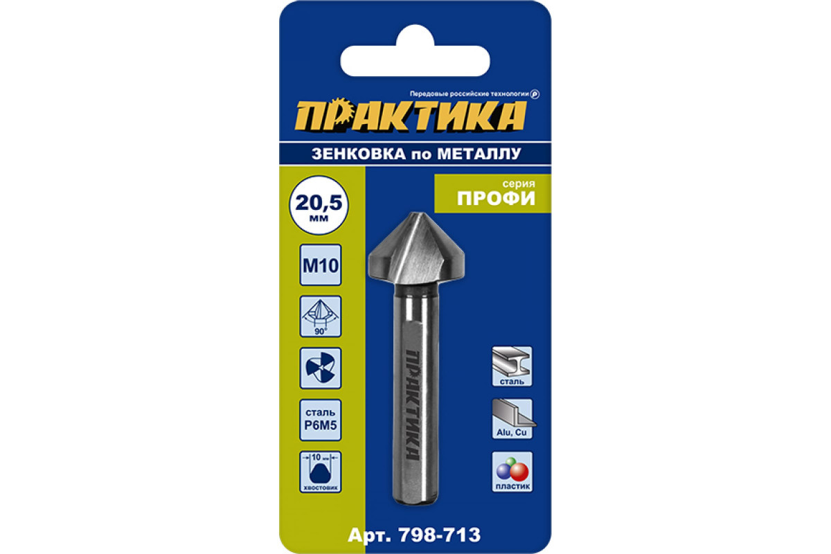 Зенковка по металлу 20.5x63 мм, 90 град., под резьбу М10 ПРАКТИКА 798-713 предназначена для снятия фаски по краю отверстия или формирования конического углубления под потайные головки крепежных элементов в стали с пределом прочности до 900 Н/мм2, сером чугуне, цветных металлах и твердом пластике. Изготовлена из быстрорежущей стали Р6М5 с поверхностным упрочнением режущей кромки.